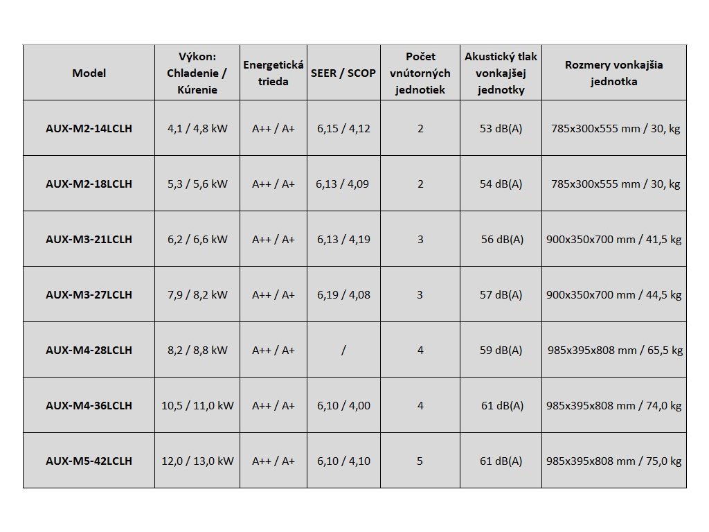 Multi split systém AUX umožňuje inštaláciu 2 až 5 vnútorných jednotiek na jednu vonkajšiu jednotku. V ponuke je 6 modelov vonkajších jednotiek poskytujúcich chladiaci výkon od 4,1 do 12,0 kW. Zariadenia pracujú s ekologickým chladivom R32 a modernou invertorovou technológiou, ktorá poskytuje spoľahlivosť a energetickú účinnosť. Ponúkajú stabilnú prevádzku v širokom rozsahu okolitých teplôt, v rozsahu od -15 °C do 52 °C v režime chladenia a od -22 °C do 24 °C v režime vykurovania. Systém umožňuje navrhnúť chladiace systémy s celkovou dĺžkou až 80 metrov v závislosti od výkonu kompresora a rozdielov hladín až do 15 metrov.
